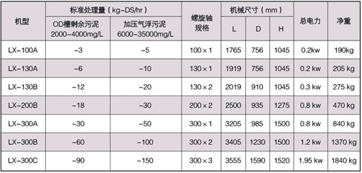 注:1、上表為參考值,處理量取決于污泥的性質(zhì)和濃度。