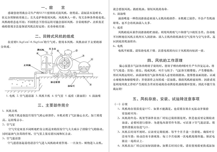 2、HF回轉(zhuǎn)式鼓風(fēng)機(jī)結(jié)構(gòu)精巧,主要由電機(jī)、空氣過(guò)濾器、鼓風(fēng)機(jī)本體、空氣室、底座(兼油箱)、滴油嘴六個(gè)部分組成。