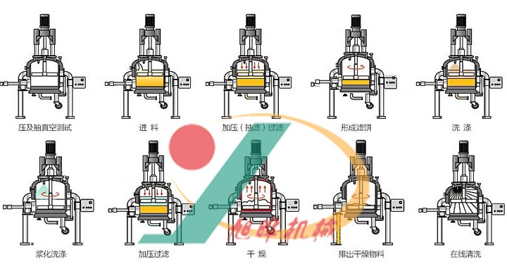 平板式過濾洗滌干燥三合一 結構與原理 過濾洗滌干燥機(業(yè)內俗稱“三合一”)能實現(xiàn)物料的過濾、洗滌、干燥、滅菌、卸料等連續(xù)工藝過程,其操作方式屬于分批式操作(間歇操作),廣泛應用于制藥、食品、農藥、化工等領域。過濾洗滌干燥機主要由承壓部分的立式罐體、加熱系統(tǒng)、攪拌系統(tǒng)(攪拌軸、攪拌槳、機械密封等)、攪拌升降機構、傳動機構、過濾介質、出料閥、噴淋裝置、滅菌裝置、液壓泵站、主電控柜(包括變頻器、PLC)等部件組成,實現(xiàn)了機、電、儀一體化! ≡谝慌锪系倪^濾、洗滌、干燥、固體卸料等基本操作過程結束后,過濾洗滌干燥機還能用溶劑再將需要進一步處理的物料溶解,連續(xù)地進行下一步操作過程。